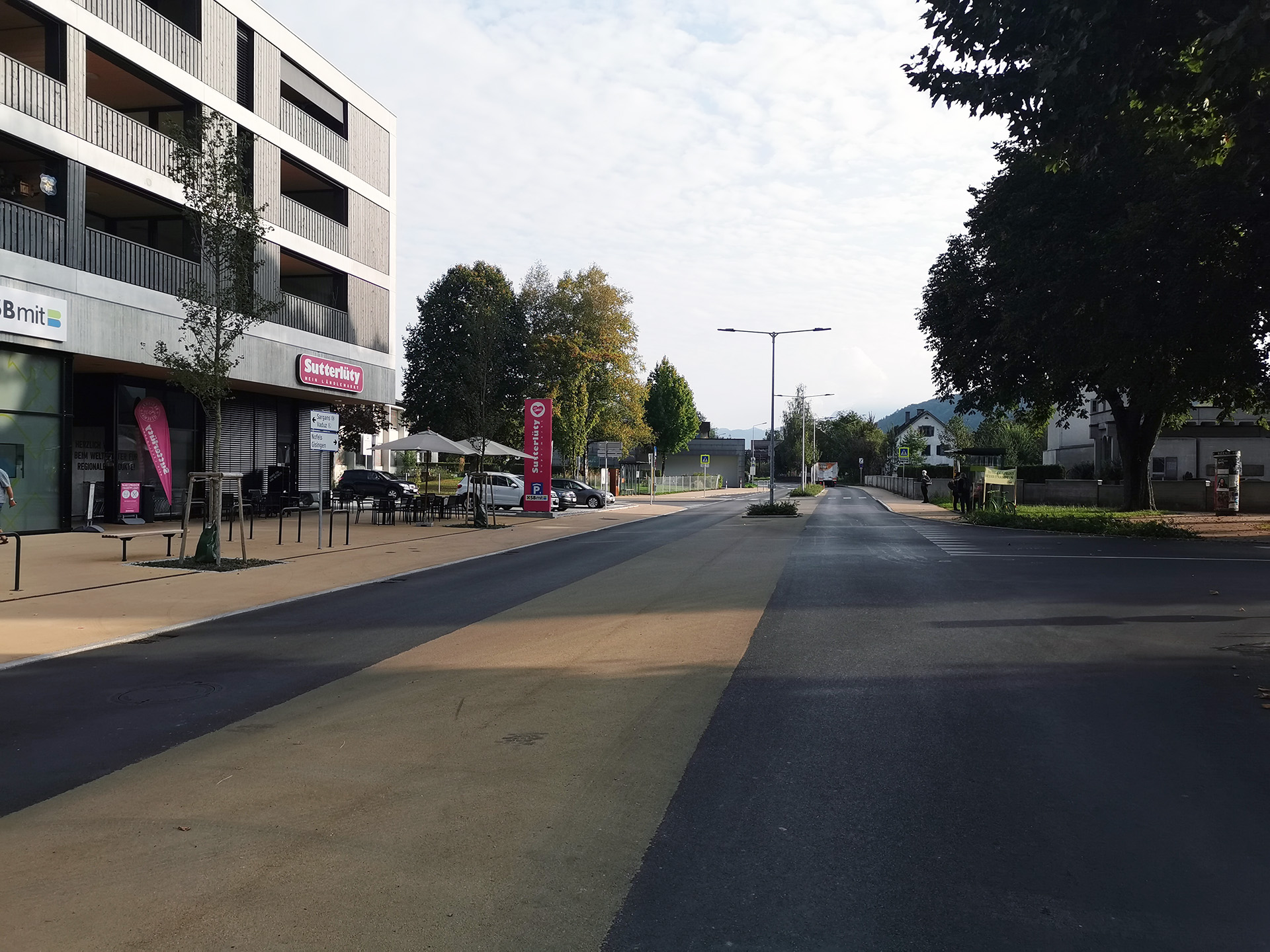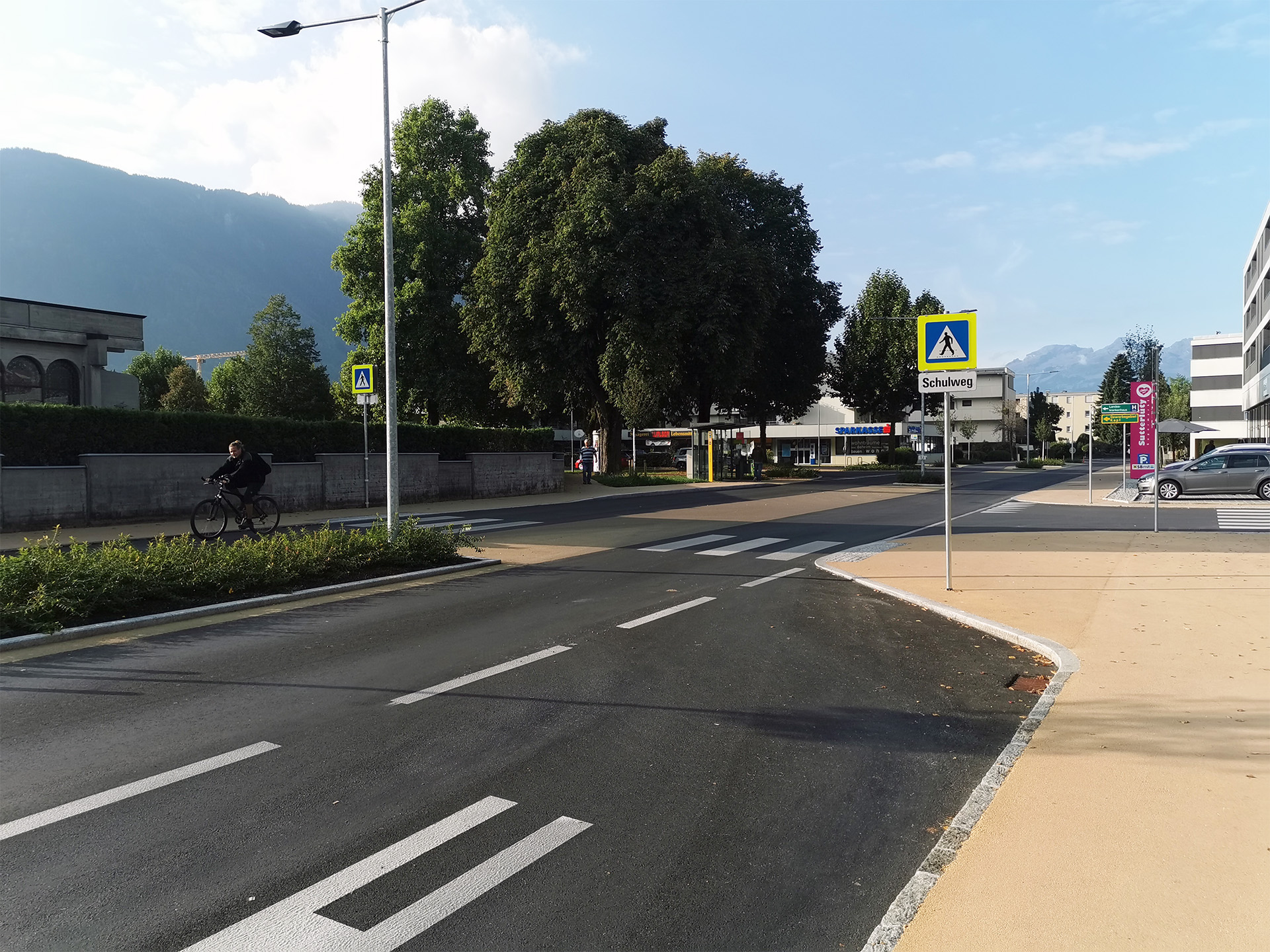 Der Mittelstreifen und die Seitenräume wurden in beigefarbenen Farbasphalt ausgeführt. Im Bereich des Mittelstreifes wurden Grüninseln, Bäume und Leuchten positioniert sowie im Bereich der Seitenräume Grünflächen und neue Baumpflanzungen angelegt. Weiters wurden die beiden Bushaltestellen umgestaltet und die Haltestelle vor der Volksschule als Busbucht ausgebildet.