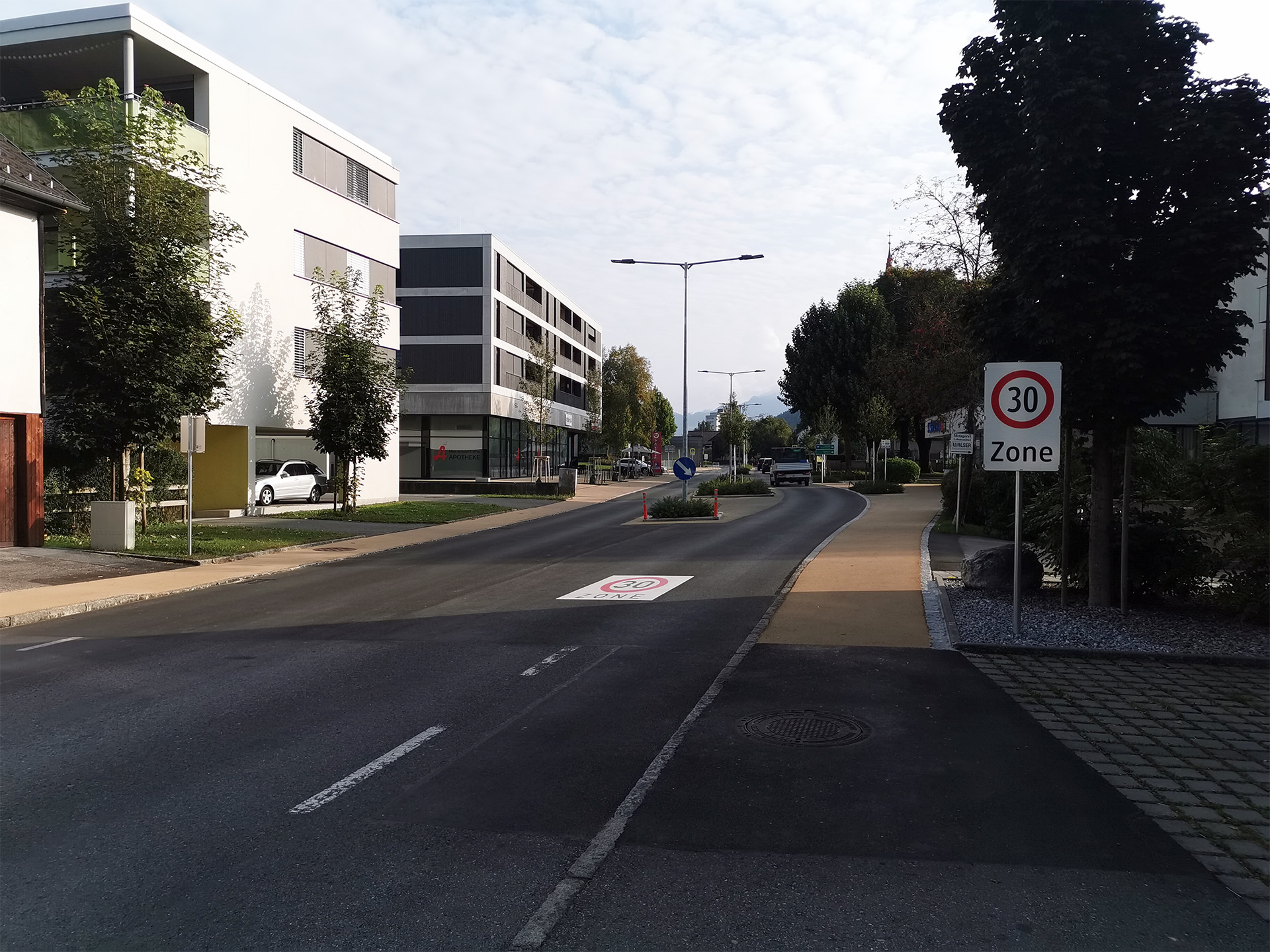 Im Auftrag der Abteilung VIIb - Straßenbau des Amts der Vorarlberger Landesregierung erarbeitete unser Büro in Feldkirch Begleitmaßnahmen im Zuge der Planung des Stadtunnels in Feldkirch. Eine dieser Begleitmaßnahmen war die Verkehrsberuhigung und Umgestaltung der Landesstraße L61 im Ortszentrum von Tosters.