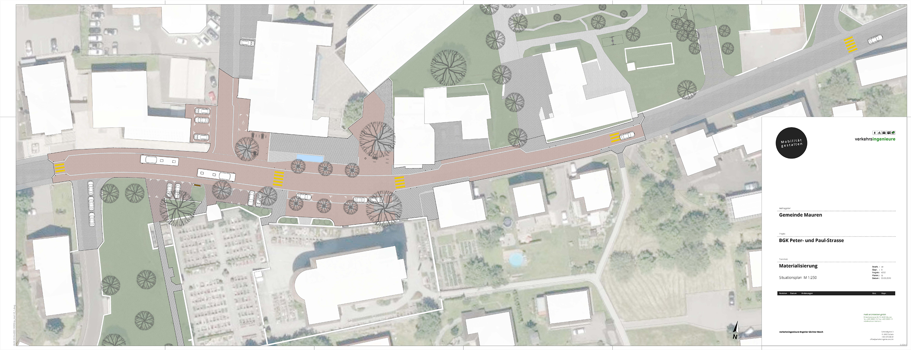 Im Zusammenhang mit der Erneuerung des Gemeindesaals sowie dem Neubau des Kindergartens und der Doppelturnhalle erstellte unser Büro in Zusammenarbeit mit einer Arbeitsgruppe, die sich aus Vertretern der Gemeinde zusammensetzte, ein Betriebs- und Gestaltungskonzept für die Peter- und Paul-Strasse im Zentrumsbereich der Gemeinde.